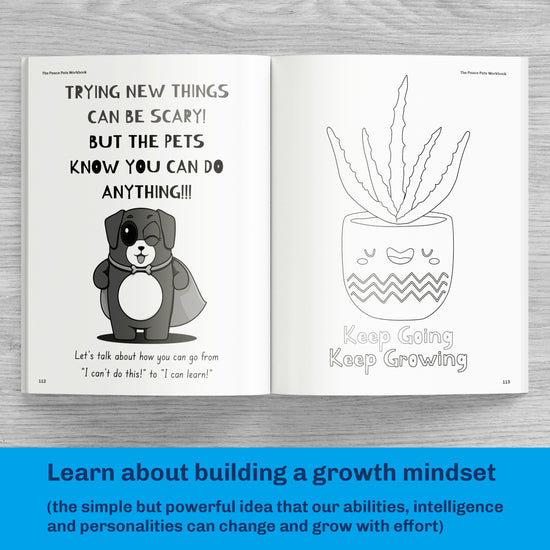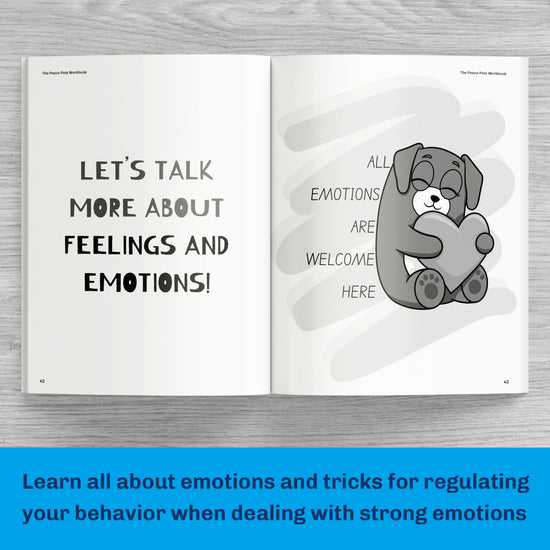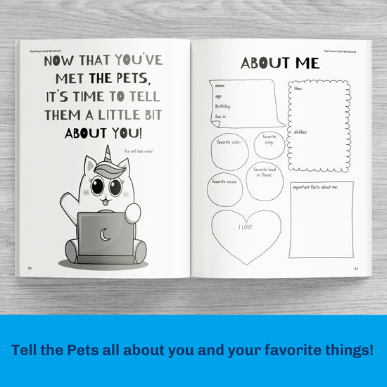 Our workbook contains fun stories about the pets as well as an emotions wheel and tracker to help you learn about your emotions, activities that help you build your self-esteem, mindfulness activities to help you sit with big emotions, and so much more!